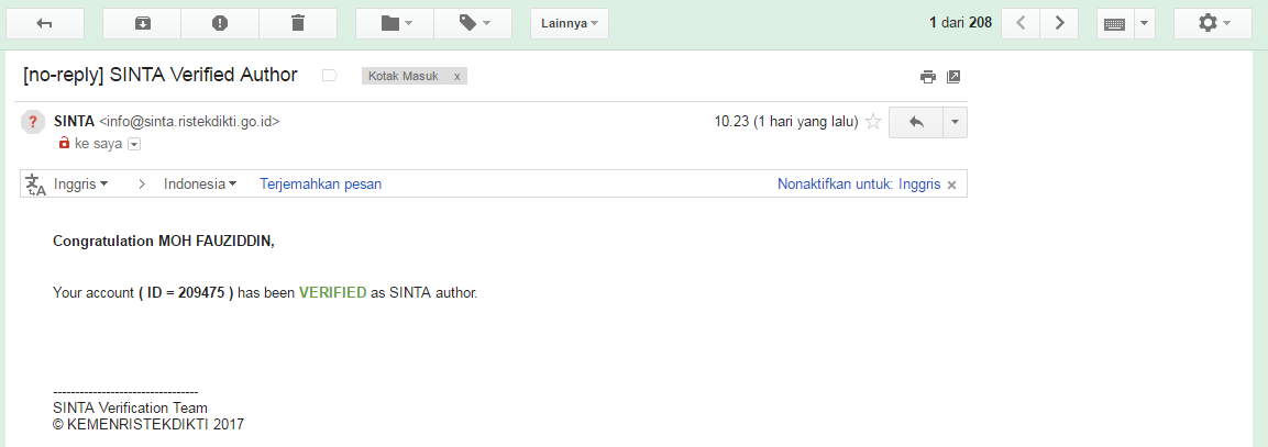Setelah klik register, maka anda akan menerima email dari info@sinta.ristekdikti.go.id
