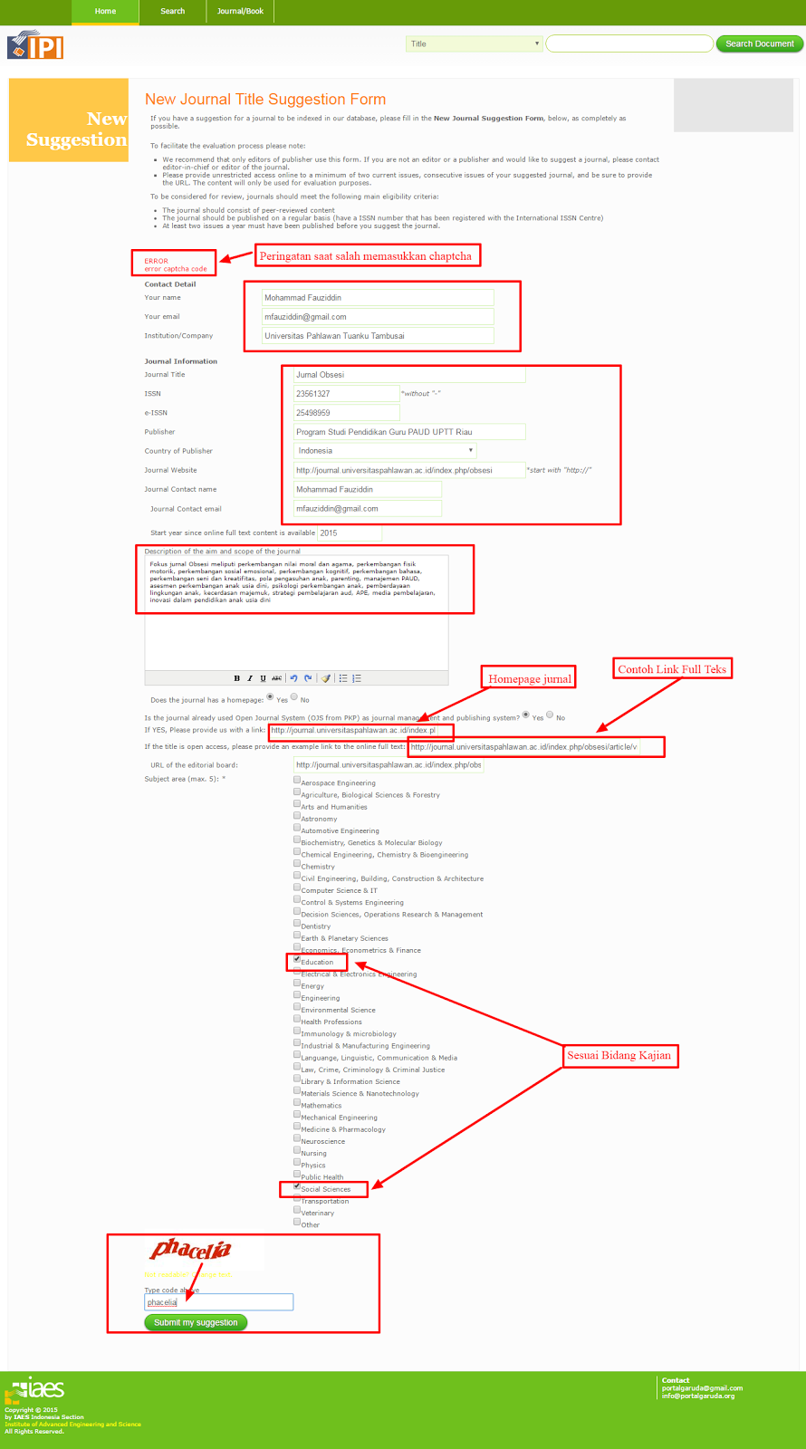 Pendaftar jurnal baru harus mengisi formulir secara online Disini  selengkap mungkin.