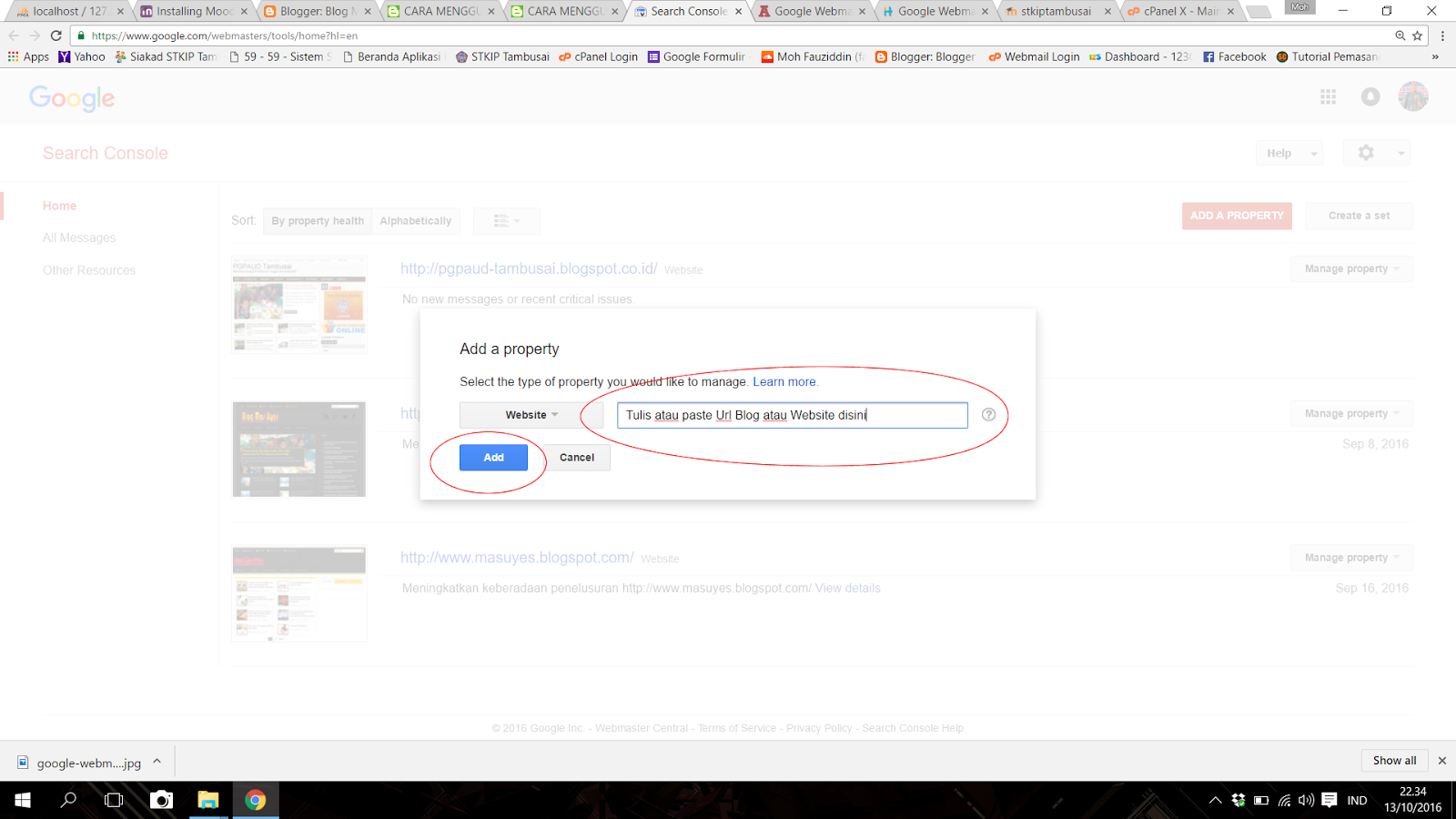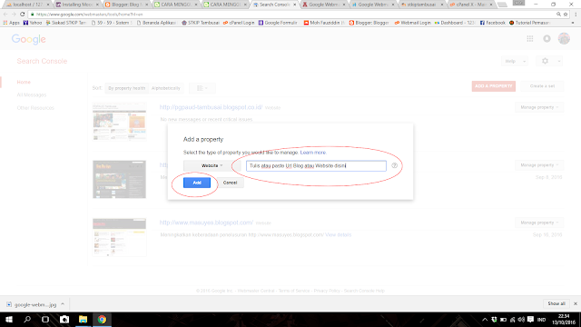 - Kemudian masukkan Url Blog atau Website yang akan didaftarkan dalam kolom yang tersedia kemudian klik Add