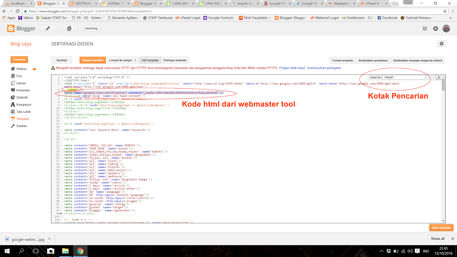 - Buka Template Blog yang di daftarkan tadi kemudian Paste tepat dibawah kode <head>