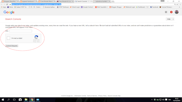 Maka akan terbuka Search Console untuk menambahkan artikel postingan. Masukkan URL Artikel Postingan ke kolom yang telah disediakan, kemudian klik pada pengenalan i am not robot kemudian akhiri dengan Submite Request