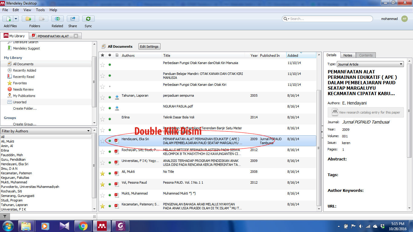 Buka Artikel yang akan kita kutip, caranya klik dua kali pada artikel yang sudah kita masukkan pada Aplikasi Mendeley