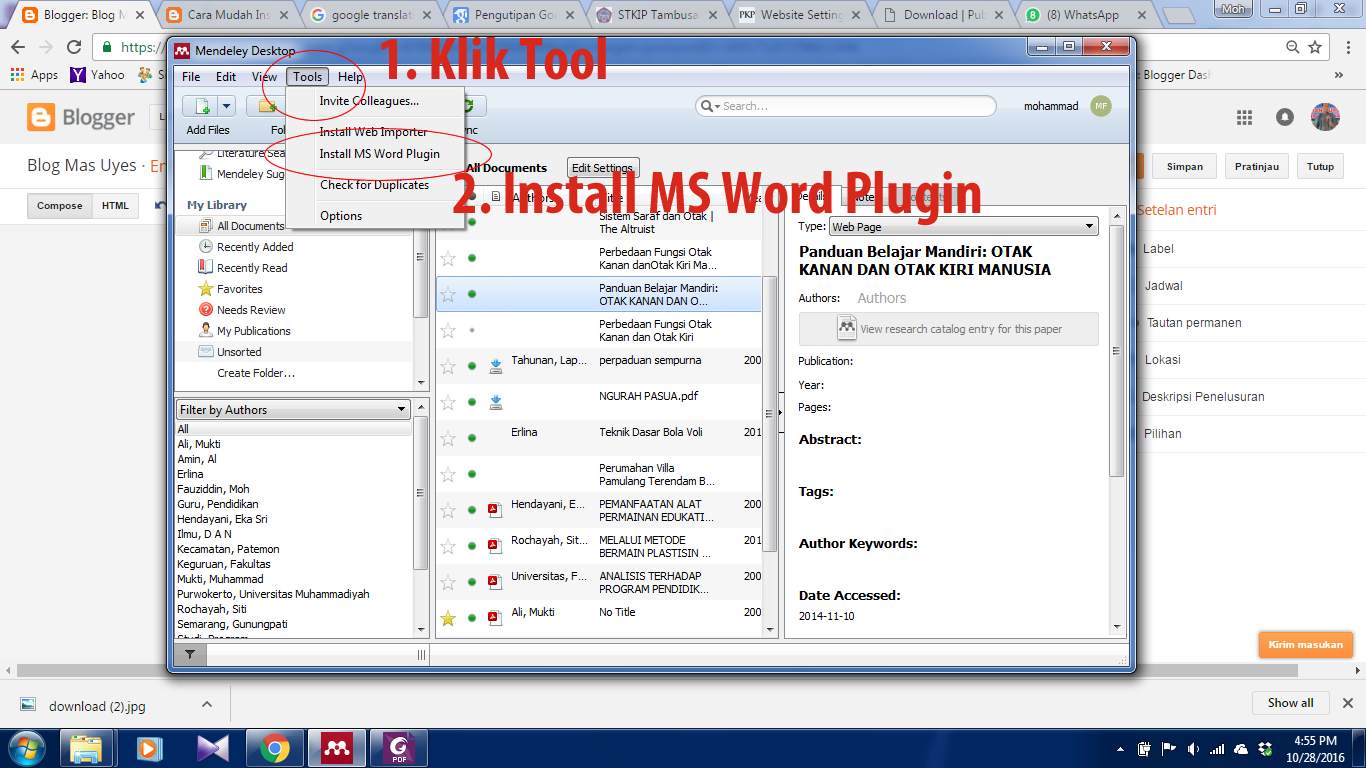 Langkah pertama Install Plugin Mendeley pada MS Word, Rekomendasi saya, gunakan MS Word Office 2010