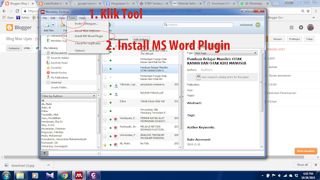 Caranya sangat mudah, kita buka aplikasi mendeley, kemudia kita masukkan artikel jurnal yang sudah kita download dari berbagai jurnal. Masukkan artikel jurnal yang berkaitan dengan artikel yang akan kita bikin ke Mendeley.