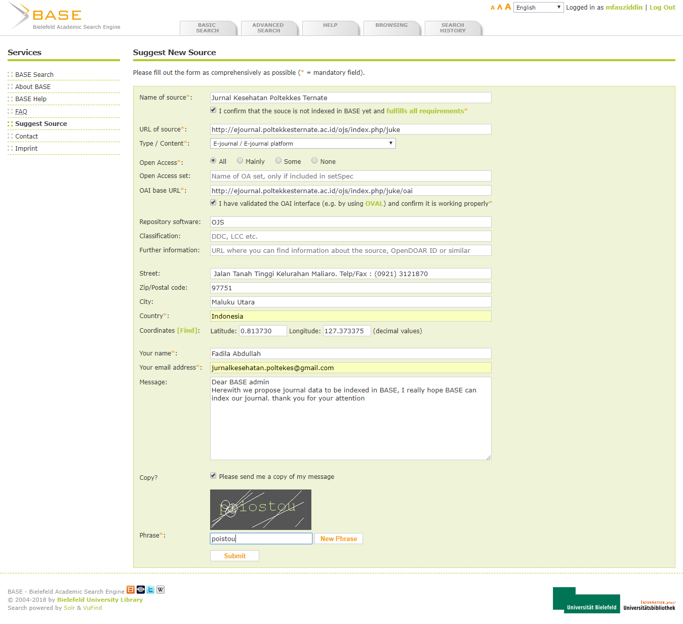 Indeksasi jurnal ke BASE sangat berguna untuk keperluan publikasi jurnal keseluruh penjuru dunia. Contoh Jurnal yang sudah terindeks BASE klik disini