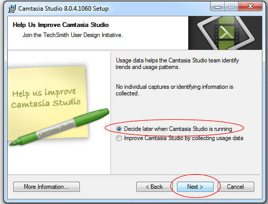 Pada Lisensi agreement kita pilih accept lisensi kemudian klik next kembali, maka kita akan ditanyakan apakah anda kita akan berpartisipasi dalam pengembangan Camtasia, pilih Decide later kemduain klik Next